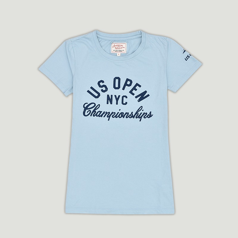 The US Open American Needle Women's Champ Brass Tacks T-Shirt is a stylish and comfortable piece that celebrates the spirit of the US Open. This tee features a classic light blue color with bold, vintage-inspired "US OPEN NYC Championships" lettering across the chest, embodying a retro aesthetic.