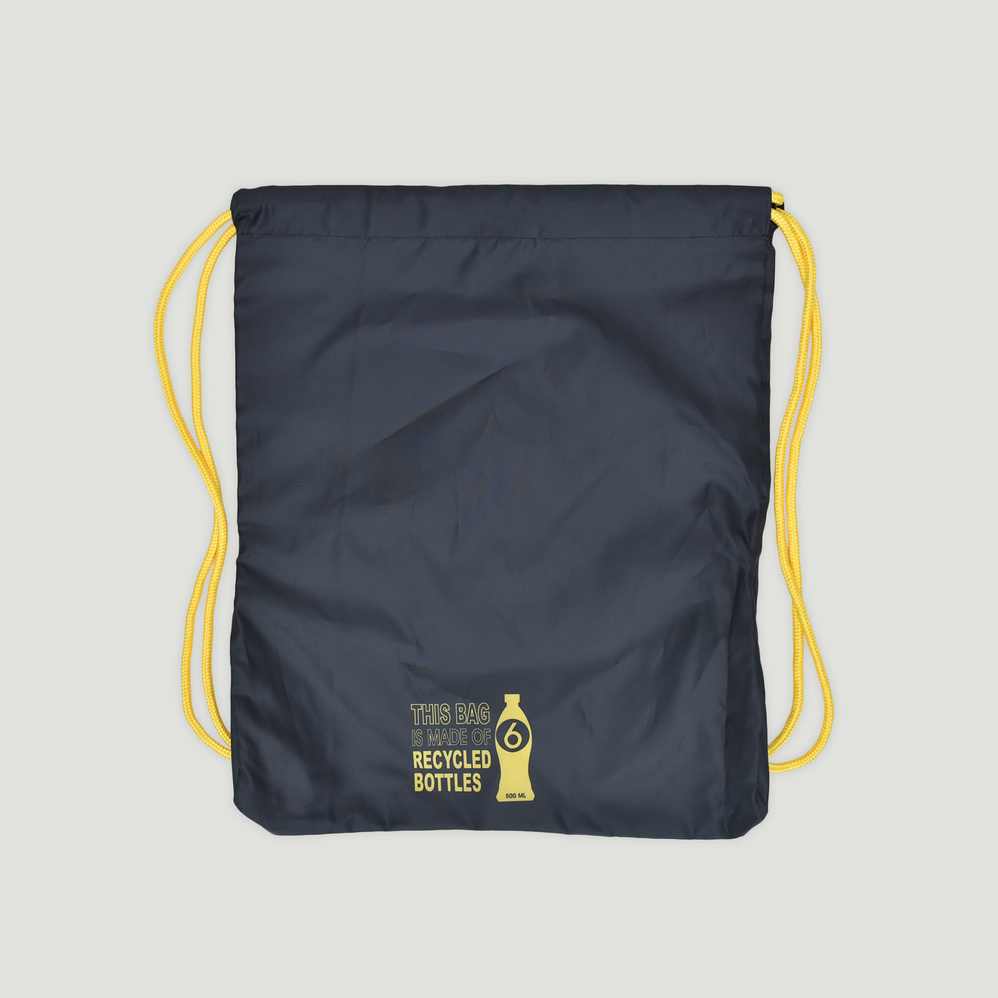 Black and yellow cinch bag with yellow straps and a side zipper pocket.